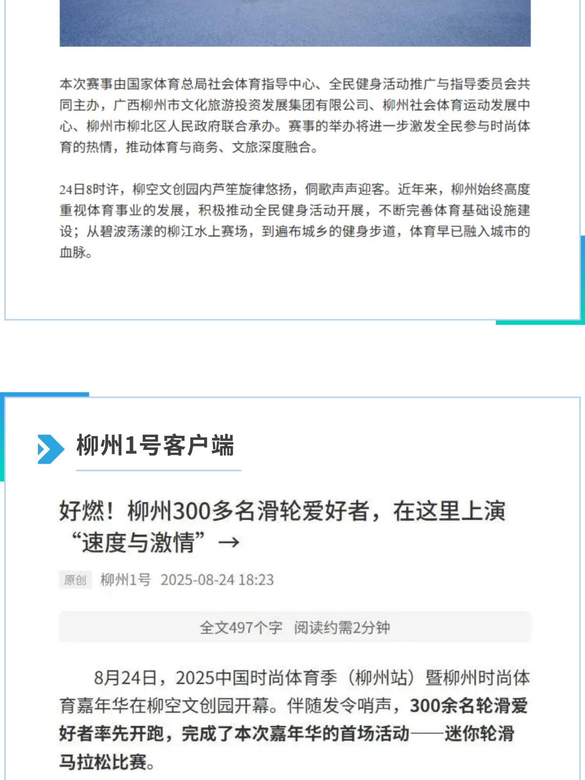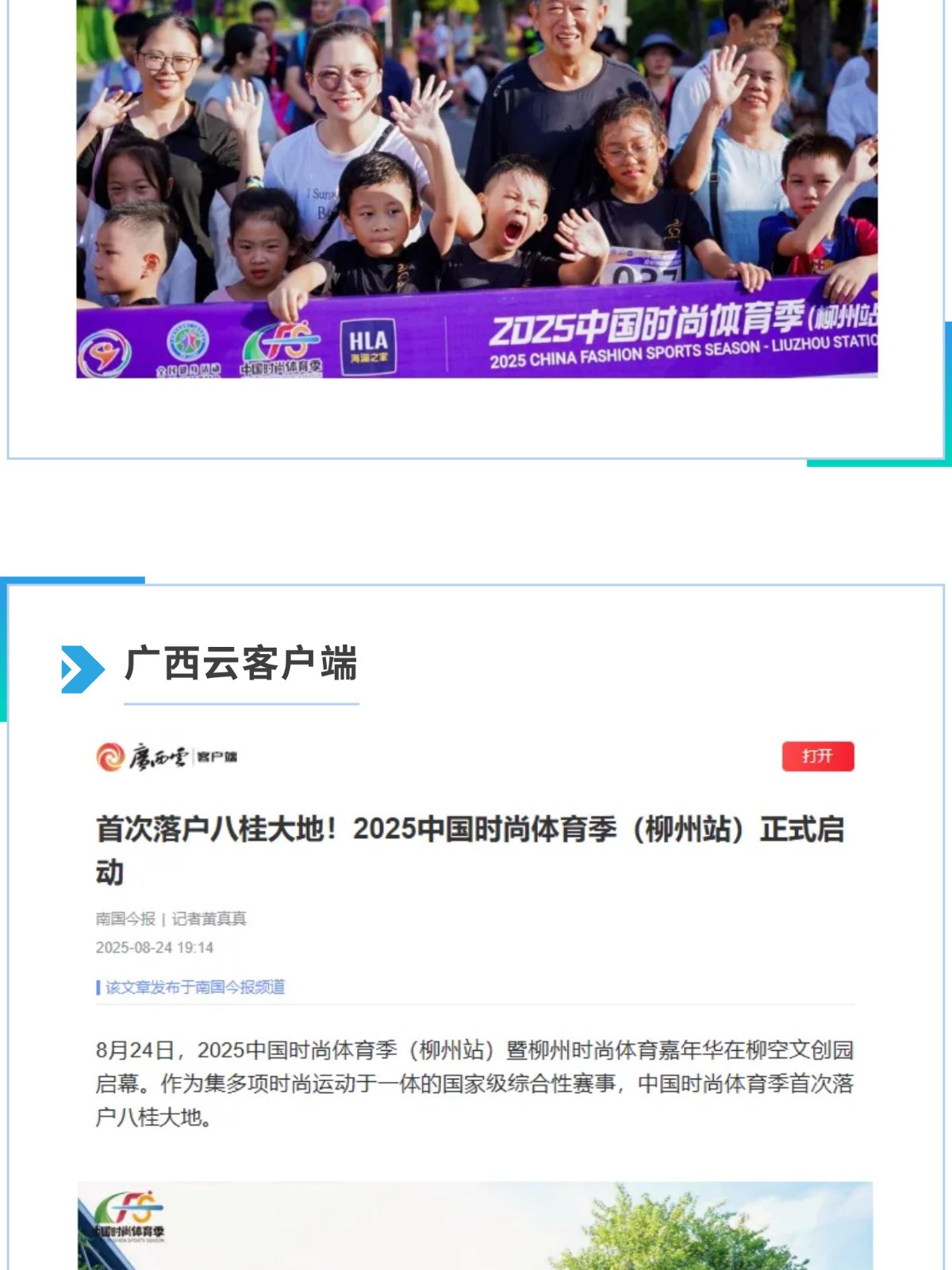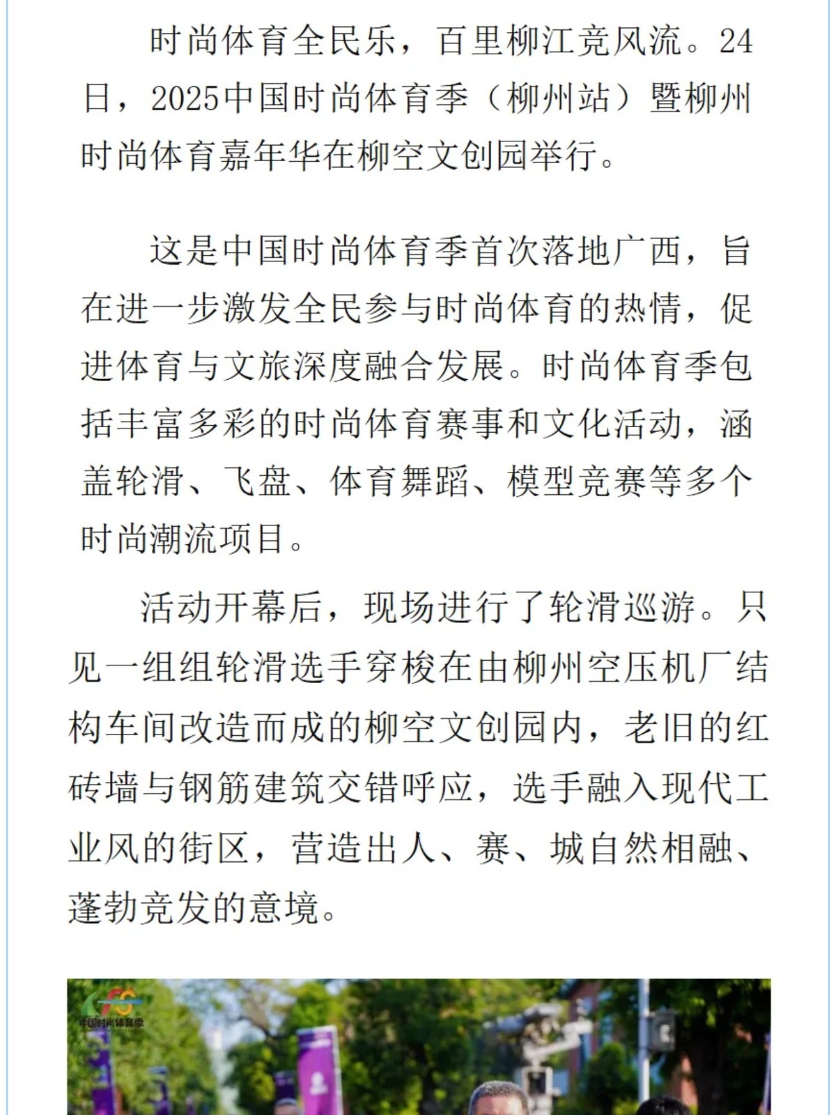多家媒體關(guān)注:2025中國(guó)時(shí)尚體育季(柳州站)在柳空文創(chuàng)園啟動(dòng) 發(fā)布時(shí)間:2025年08月29日 17時(shí)來(lái)源:本站原創(chuàng)瀏覽:232 人次