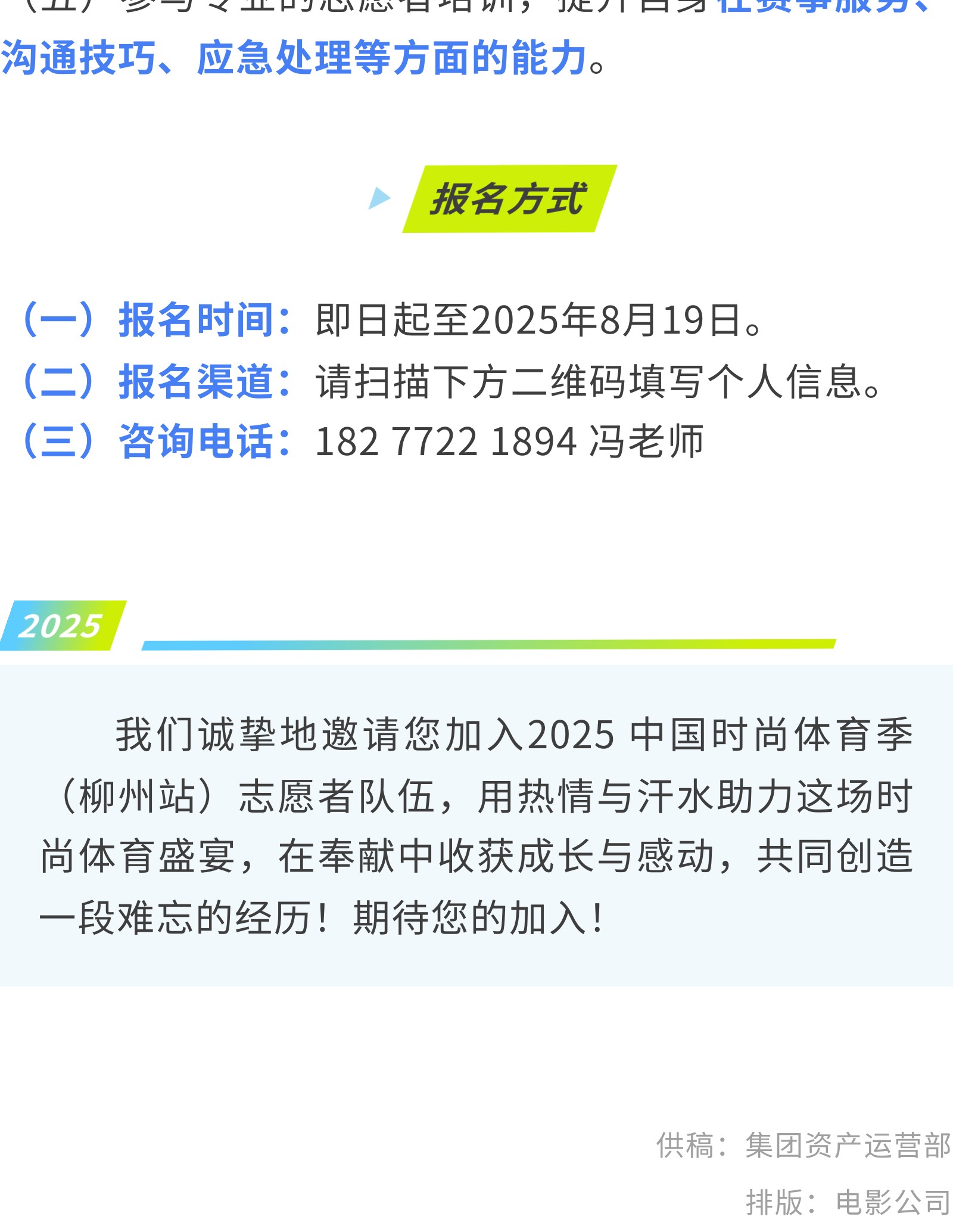 加入我們!2025 中國時(shí)尚體育季(柳州站) 志愿者招募中! 發(fā)布時(shí)間:2025年08月15日 10時(shí)來源:本站原創(chuàng)瀏覽:76 人次