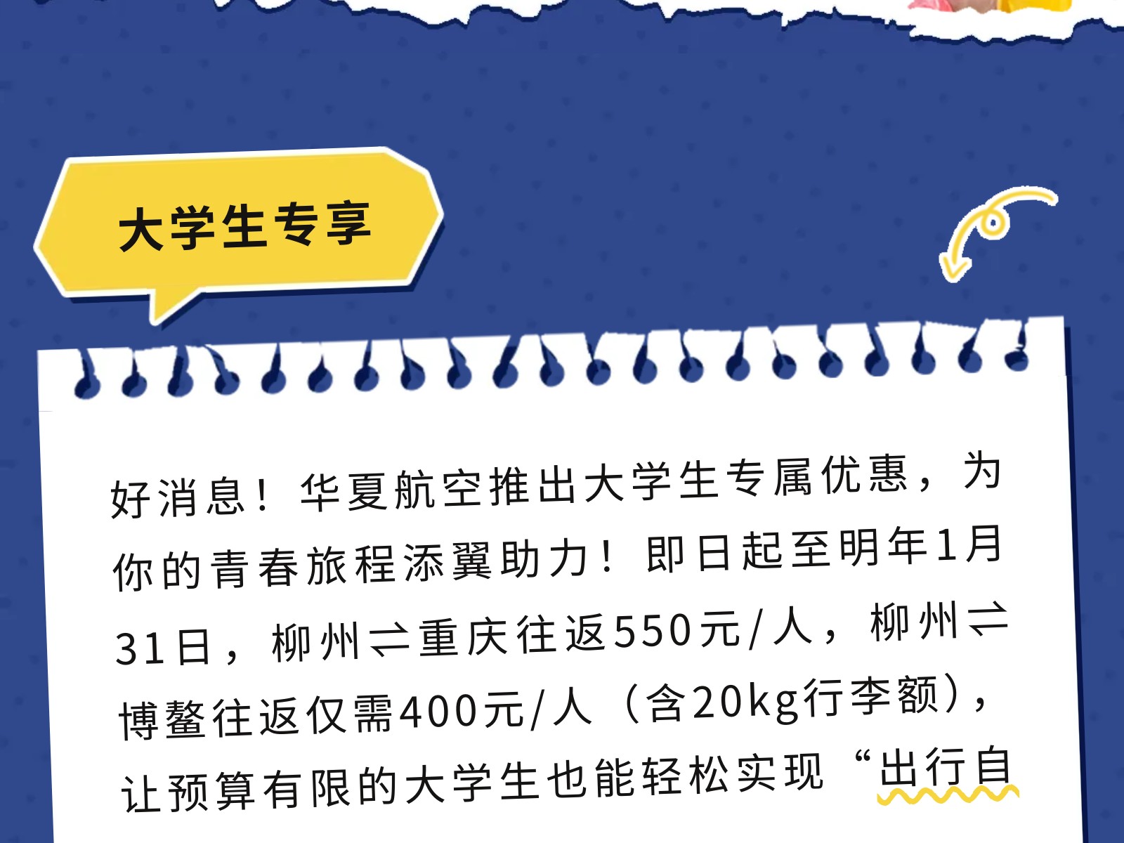 【青春專線】柳州?重慶/博鰲大學(xué)生機(jī)票來襲!雙向奔赴正當(dāng)時(shí) 發(fā)布時(shí)間:2025年12月02日 10時(shí)來源:本站原創(chuàng)瀏覽:27 人次
