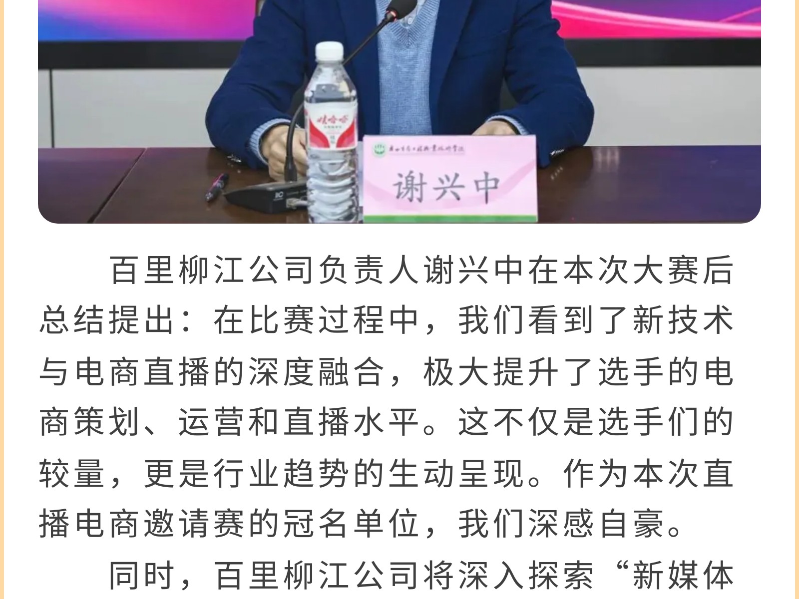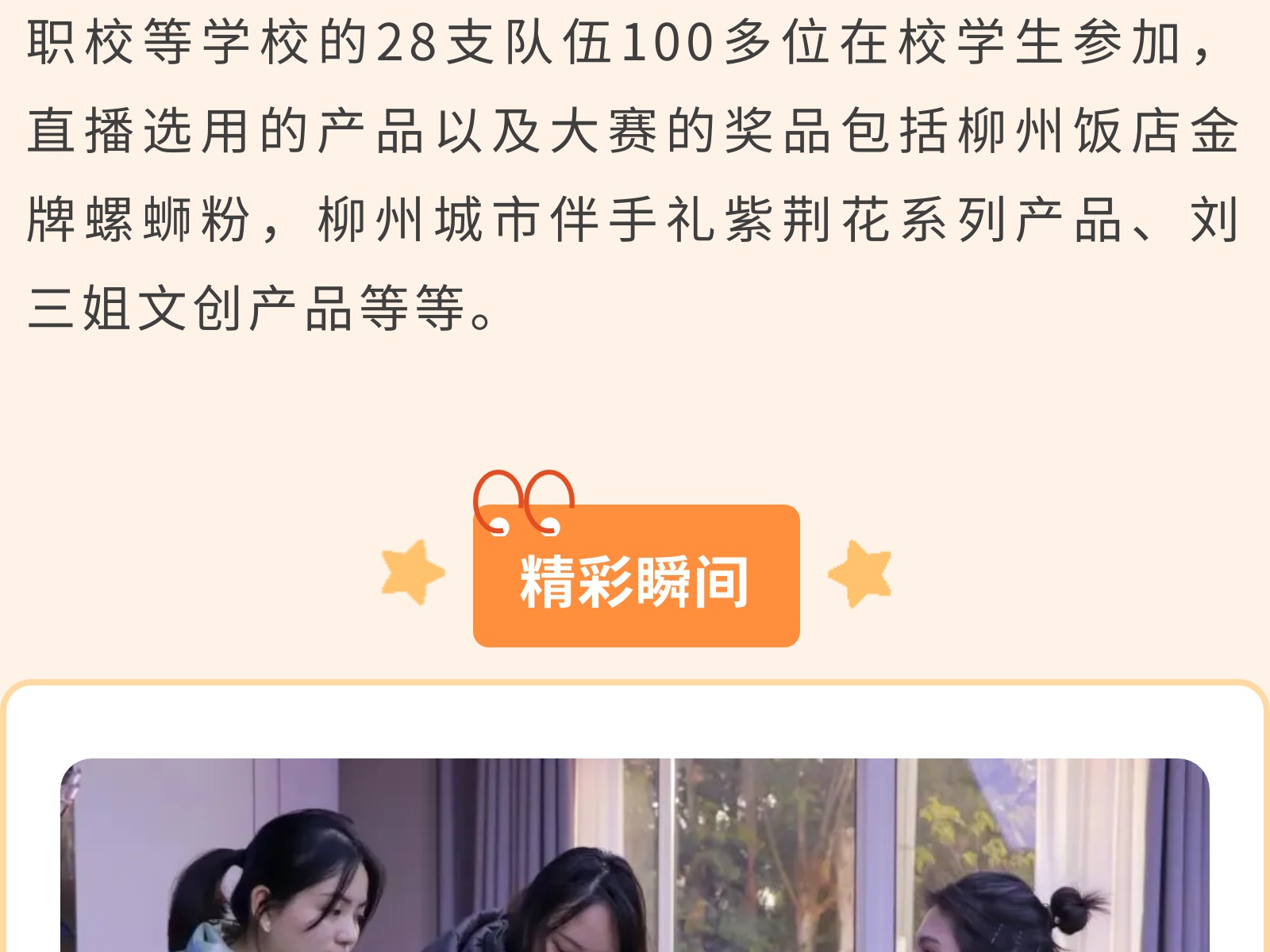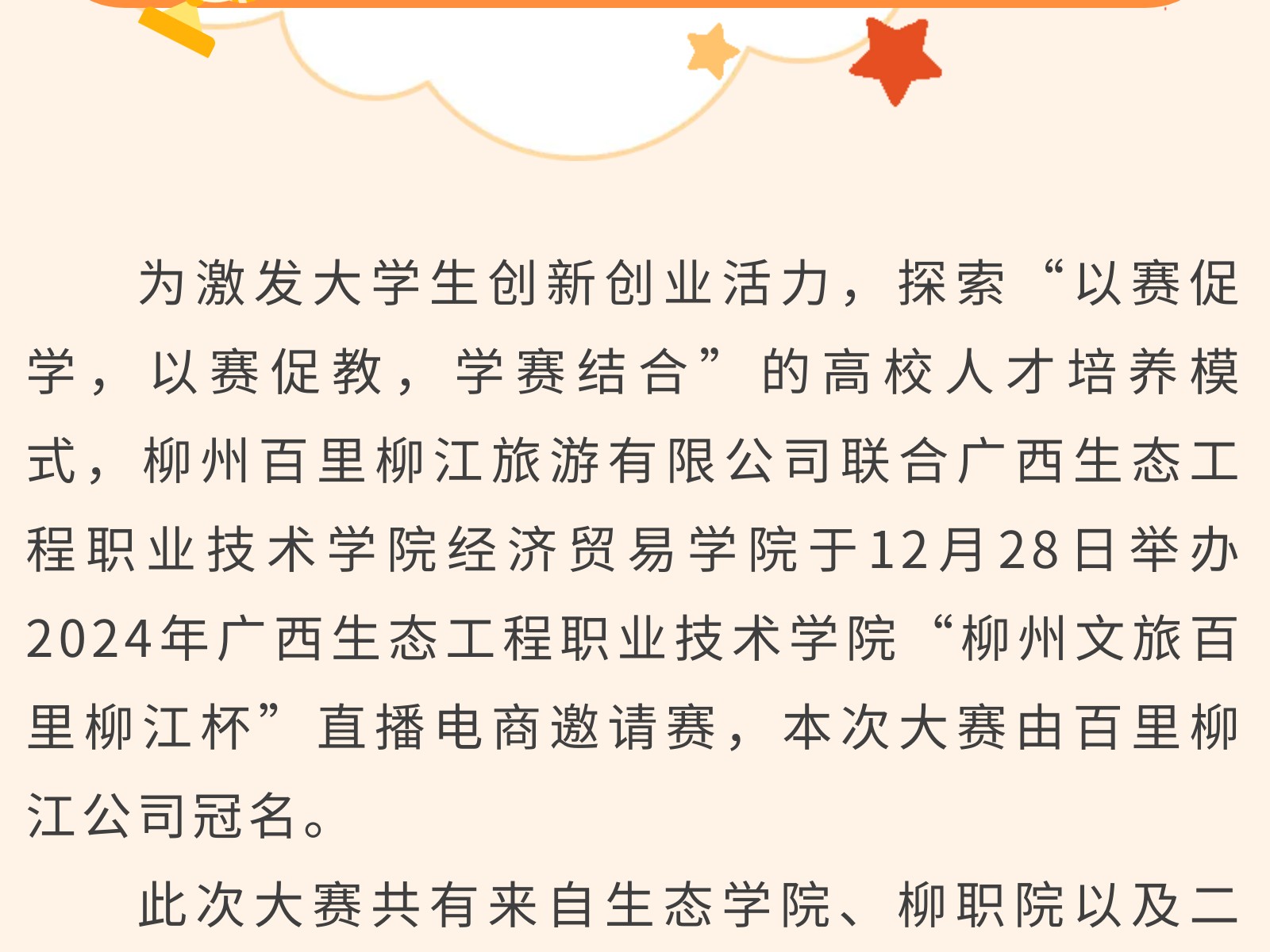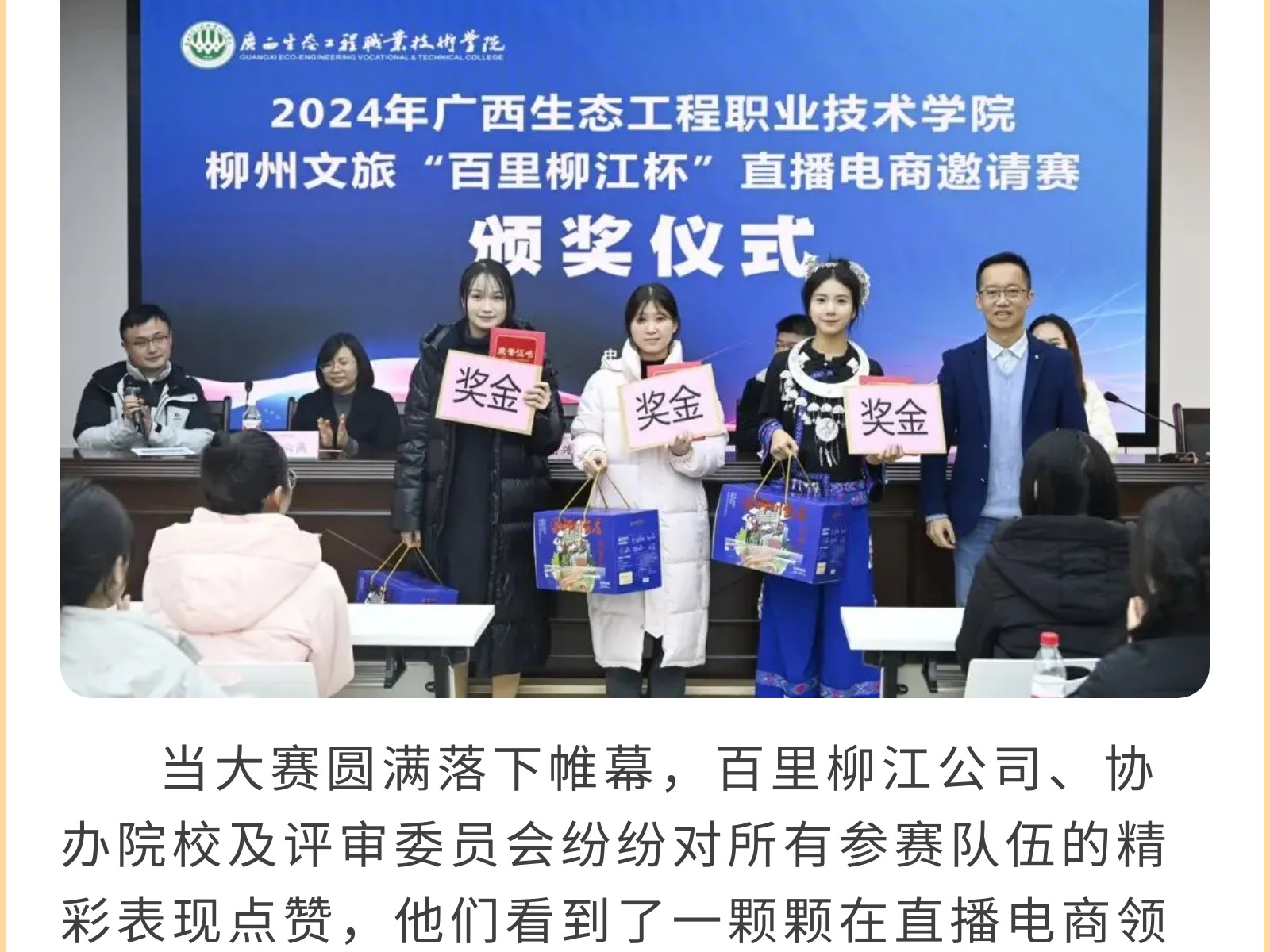 高校聯(lián)合競賽,共筑電商夢想?——2024年廣西生態(tài)工程職業(yè)技術(shù)學(xué)院柳州文旅“百里柳江杯”直播電商邀請賽圓滿落幕 發(fā)布時間:2025年01月02日 18時來源:本站原創(chuàng)瀏覽:240 人次