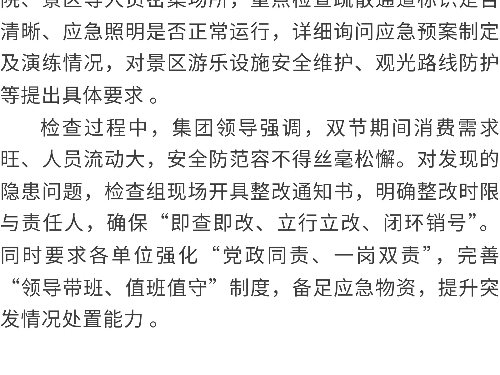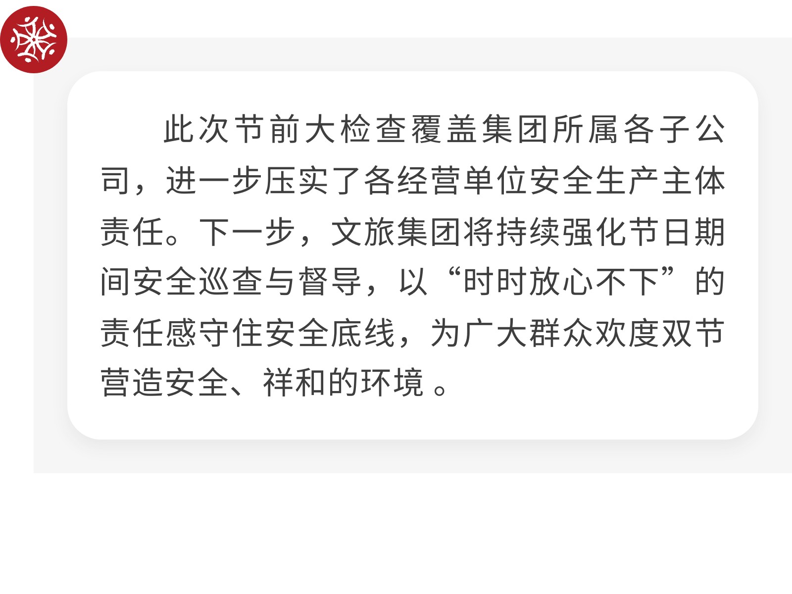 【筑牢安全防線 護航雙節(jié)安寧】文旅集團開展節(jié)前安全(消防)生產(chǎn)大檢查 發(fā)布時間:2025年09月30日 17時來源:本站原創(chuàng)瀏覽:128 人次