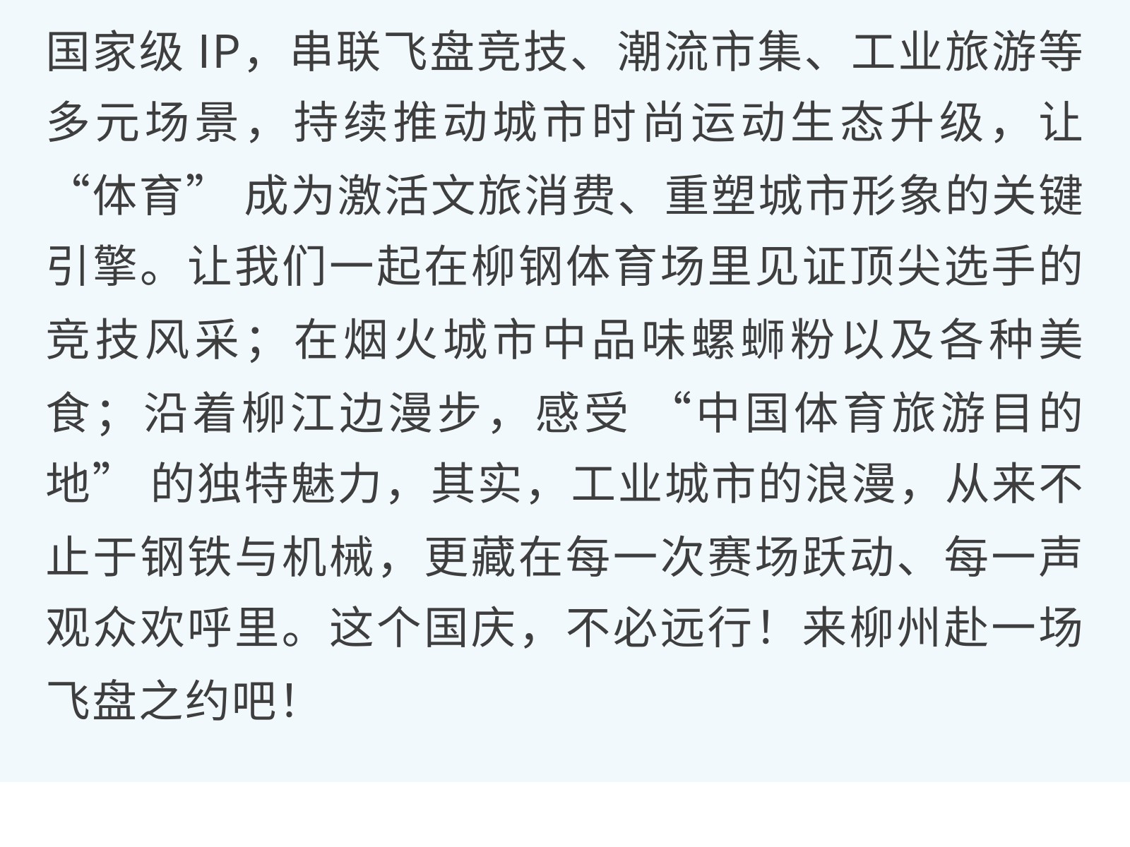 國慶赴柳!鋼鐵賽場飛盤燃,柳州這座體育旅游之城藏不住了 發(fā)布時間:2025年10月02日 17時來源:本站原創(chuàng)瀏覽:49 人次