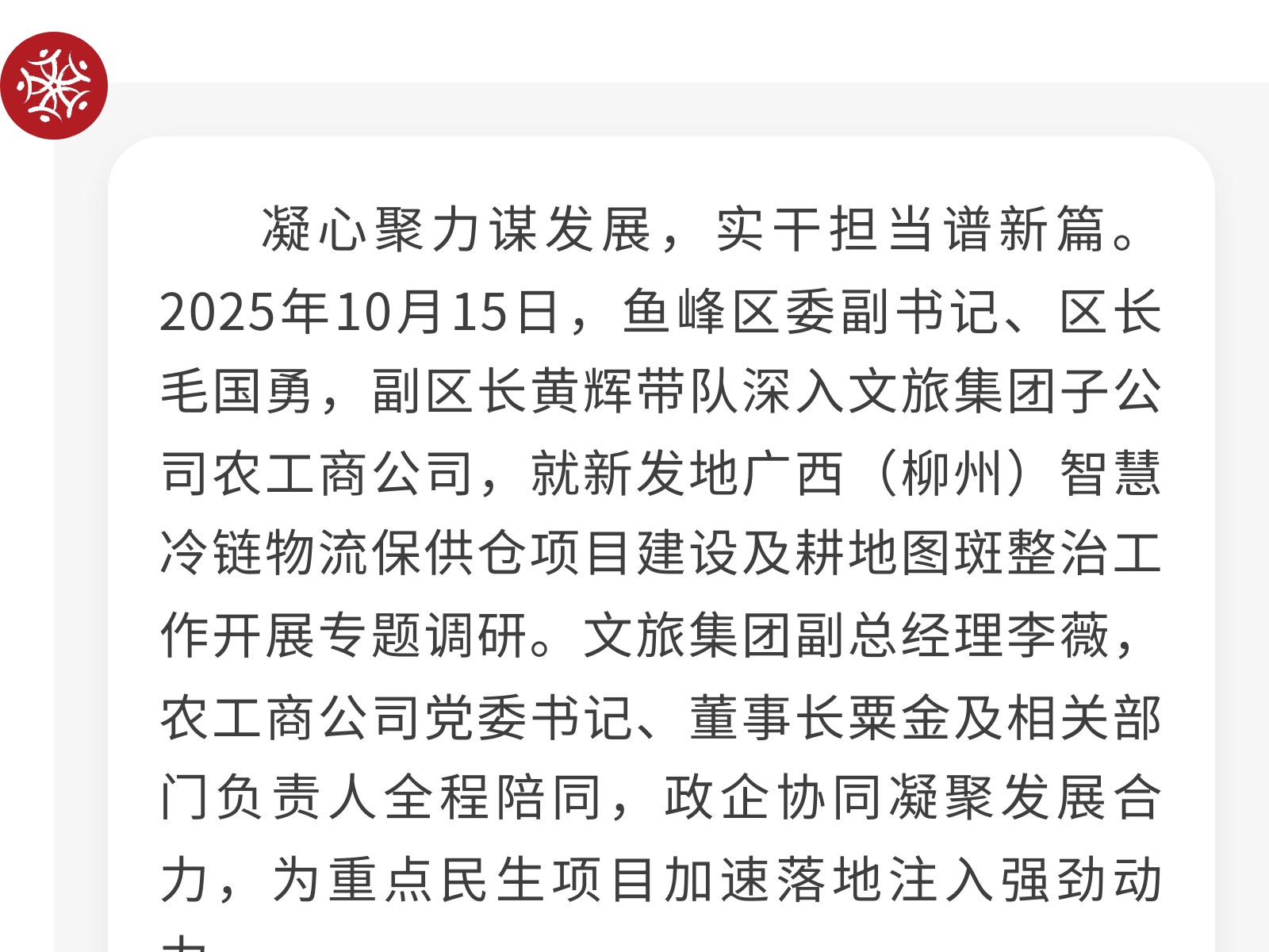 魚峰區(qū)政府主要領(lǐng)導(dǎo)深入調(diào)研指導(dǎo) 文旅集團農(nóng)工商公司全力推進重點民生項目落地 發(fā)布時間:2025年10月16日 09時來源:本站原創(chuàng)瀏覽:82 人次