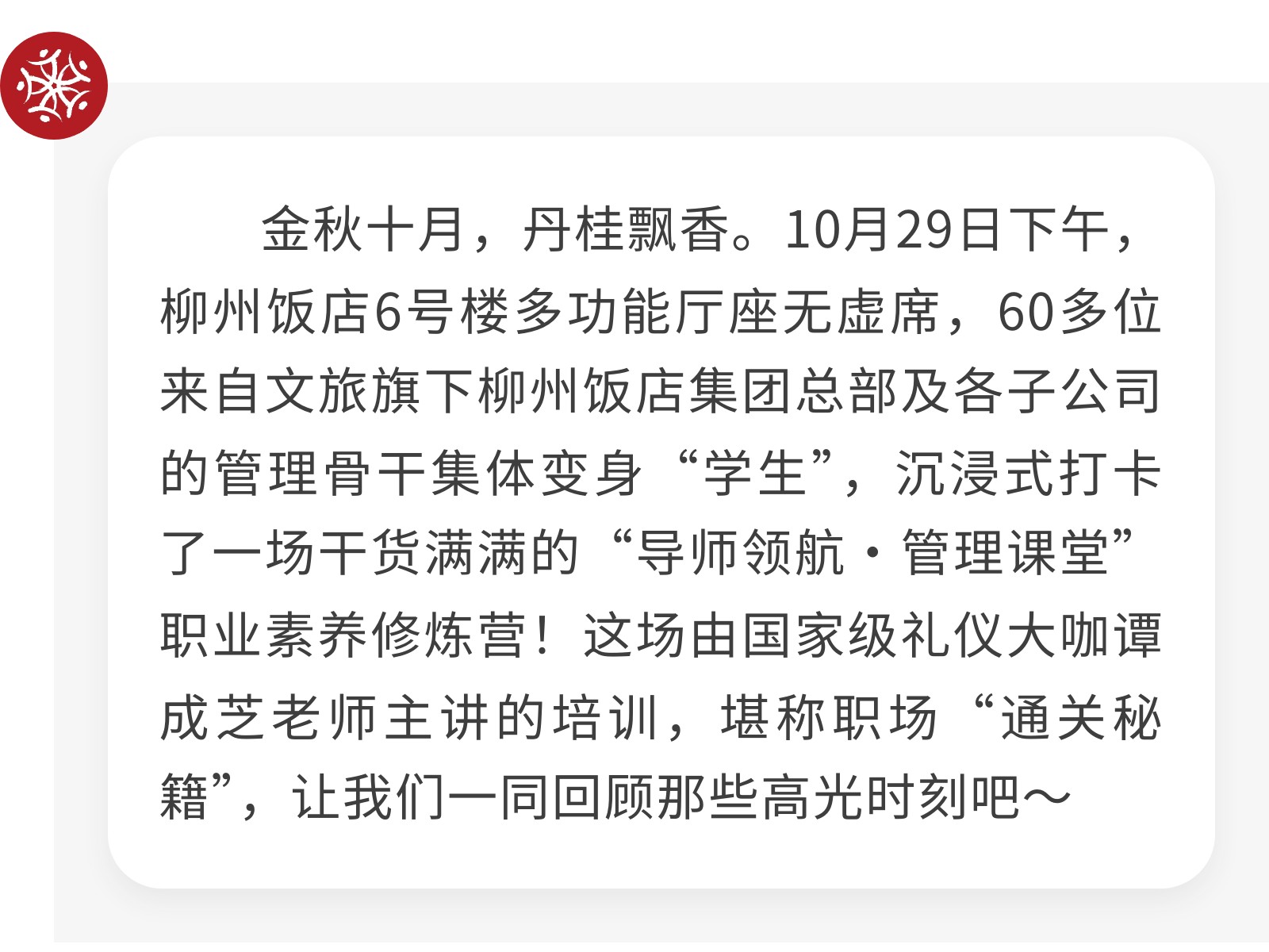 柳州飯店集團“導師領航·管理課堂”職業(yè)素養(yǎng)修煉營圓滿舉辦 發(fā)布時間:2025年10月31日 10時來源:本站原創(chuàng)瀏覽:72 人次