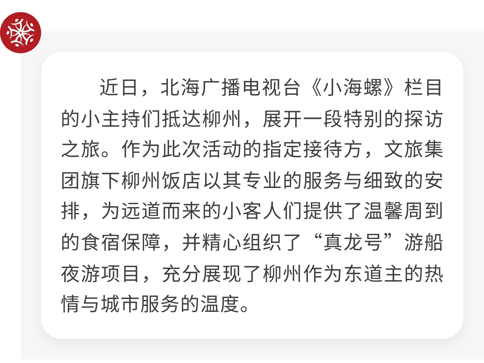 柳州飯店暖心接待北?!靶『B荨?,乘“真龍?zhí)枴惫操p柳江夜景暢談雙城情誼 發(fā)布時間:2025年11月07日 10時來源:本站原創(chuàng)瀏覽:83 人次