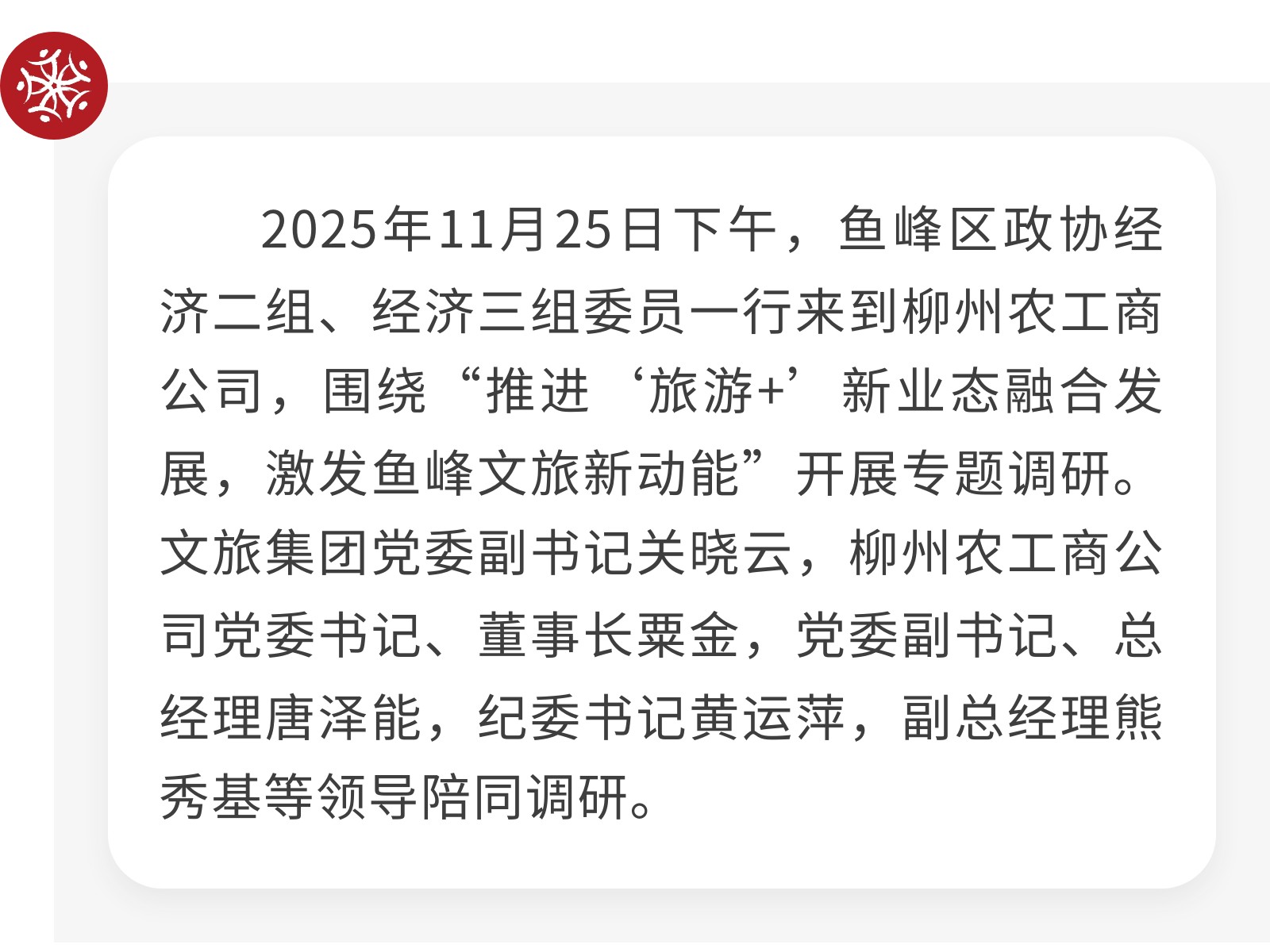 【政協(xié)來“把脈”,文旅添“動能”】魚峰區(qū)政協(xié)專題調(diào)研農(nóng)工商公司 發(fā)布時間:2025年11月28日 09時來源:本站原創(chuàng)瀏覽:23 人次