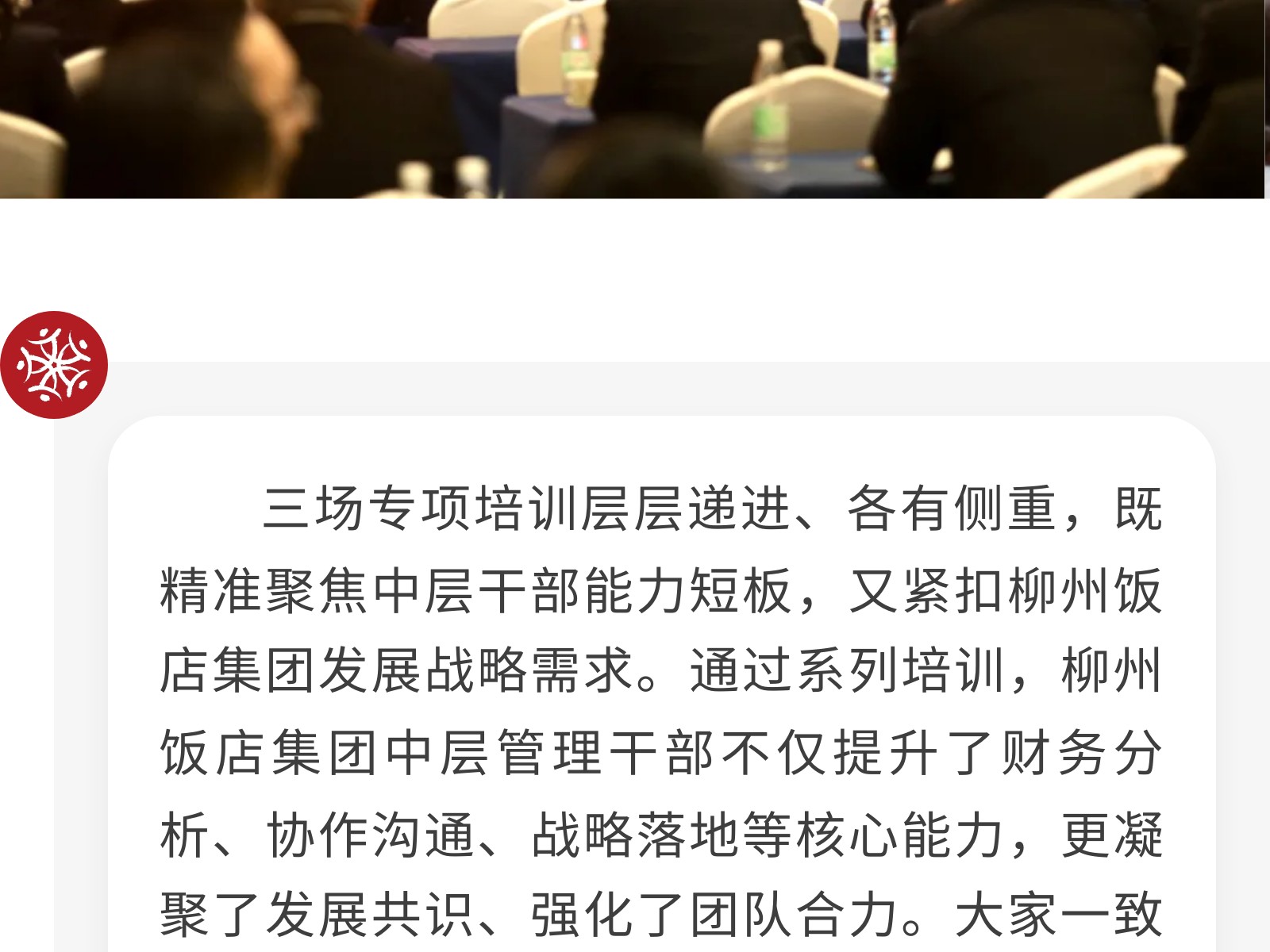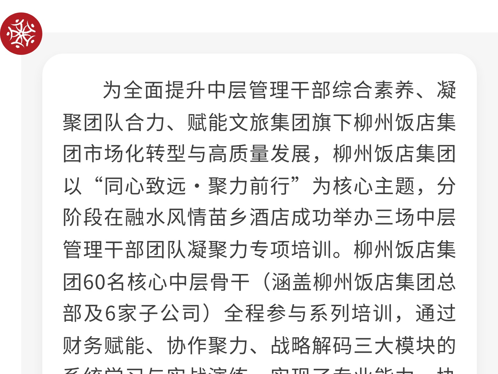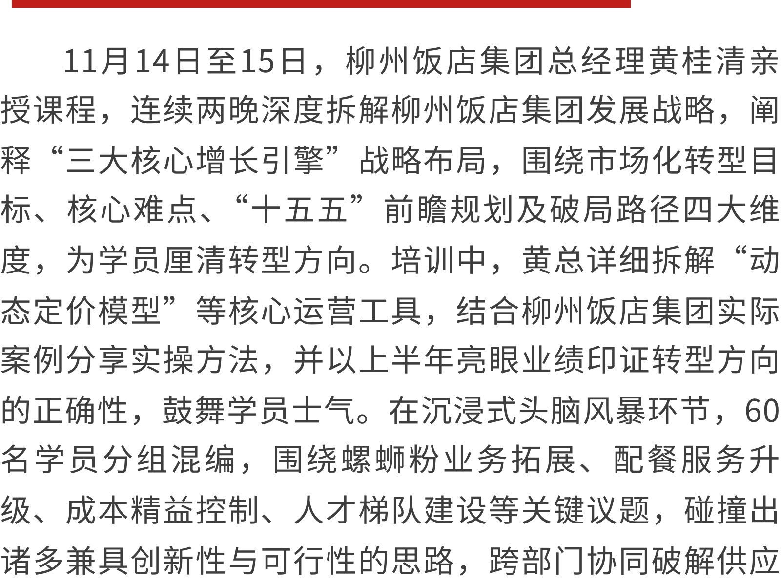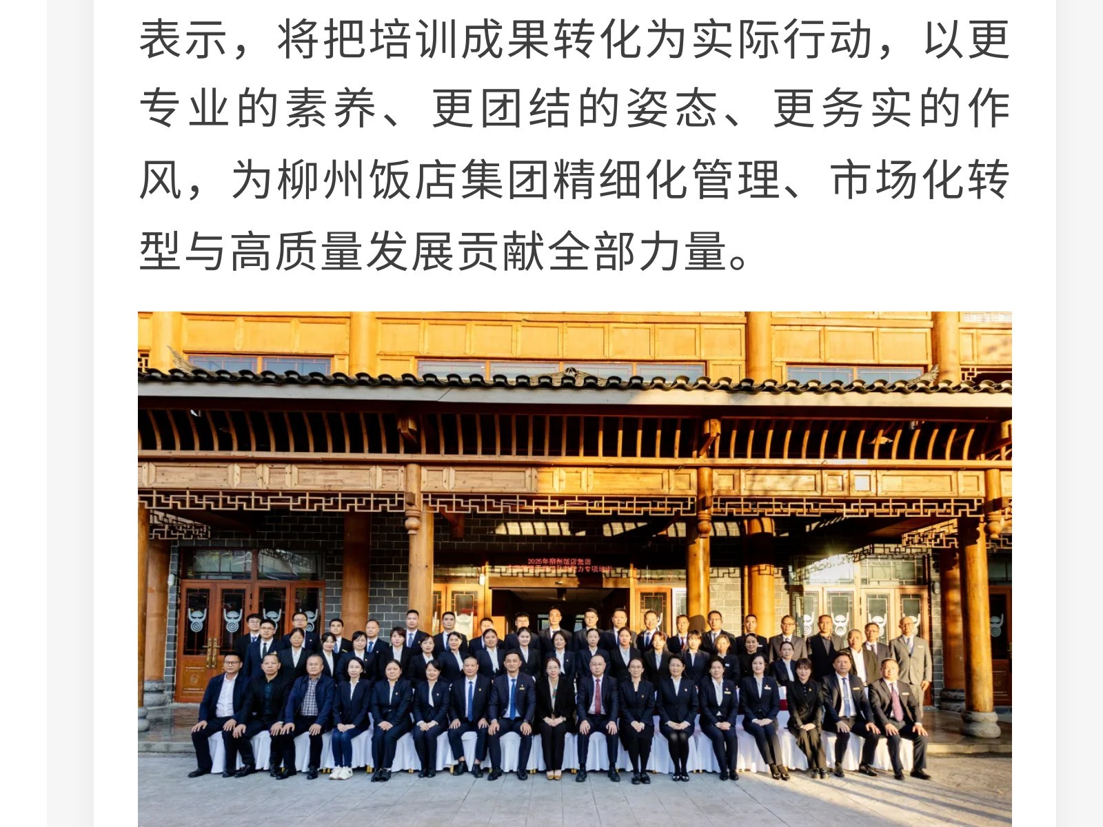 【同心致遠,聚力前行】柳州飯店集團中層管理干部團隊凝聚力系列專項培訓(xùn)圓滿收官 發(fā)布時間:2025年12月01日 09時來源:本站原創(chuàng)瀏覽:22 人次