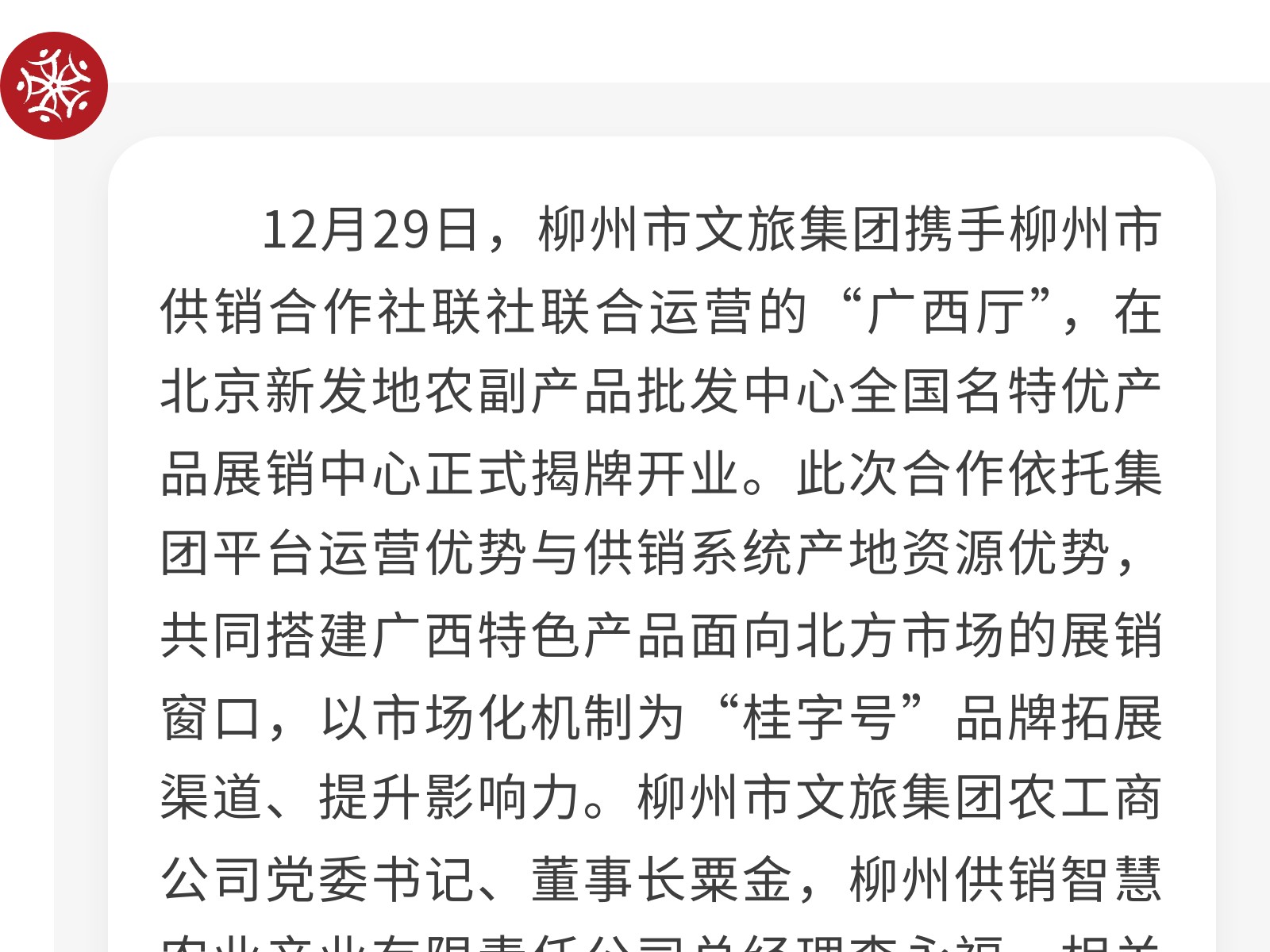 文旅集團(tuán)北京新發(fā)地廣西廳隆重揭牌開業(yè)——打造桂品入京新窗口 助力區(qū)域經(jīng)濟(jì)協(xié)同發(fā)展 發(fā)布時(shí)間:2025年12月30日 11時(shí)來源:本站原創(chuàng)瀏覽:60 人次
