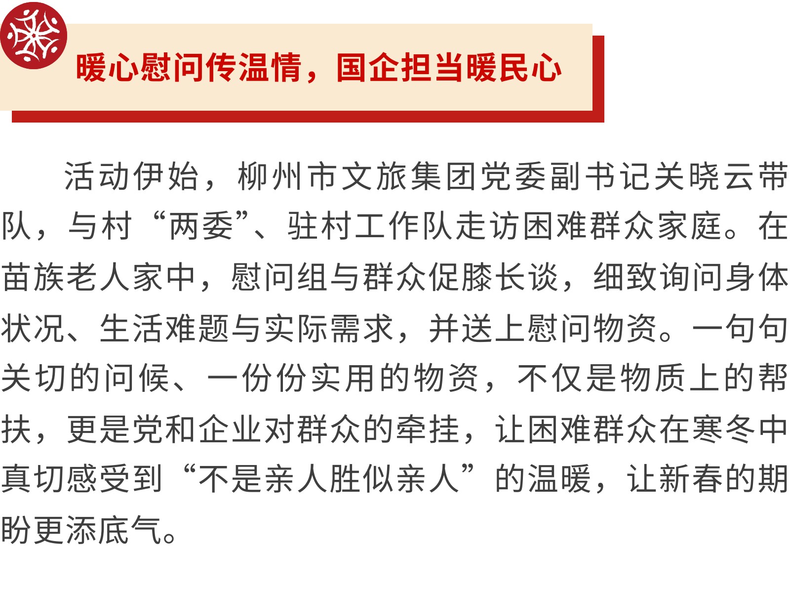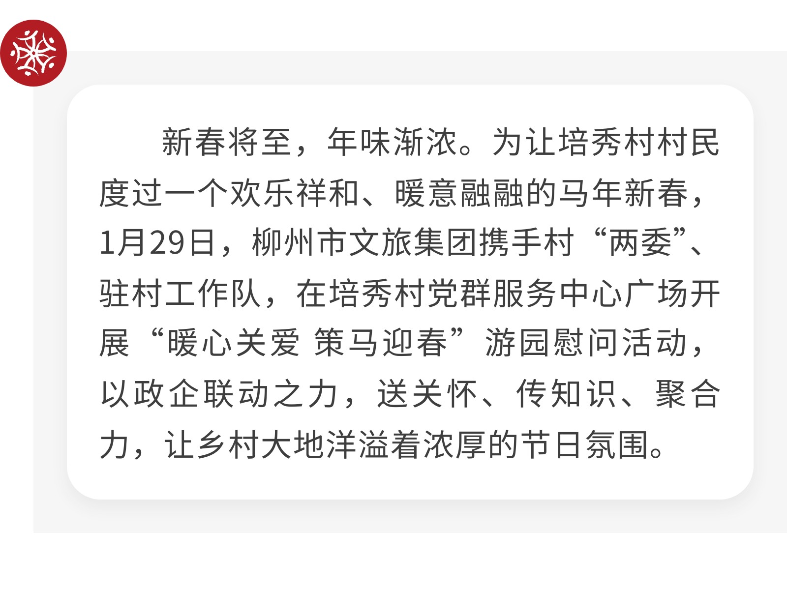 【鄉(xiāng)村振興】聯(lián)動暖新春,鄉(xiāng)村共歡樂——柳州市文旅集團赴培秀村開展慰問及游園活動 發(fā)布時間:2026年02月03日 15時來源:本站原創(chuàng)瀏覽:37 人次