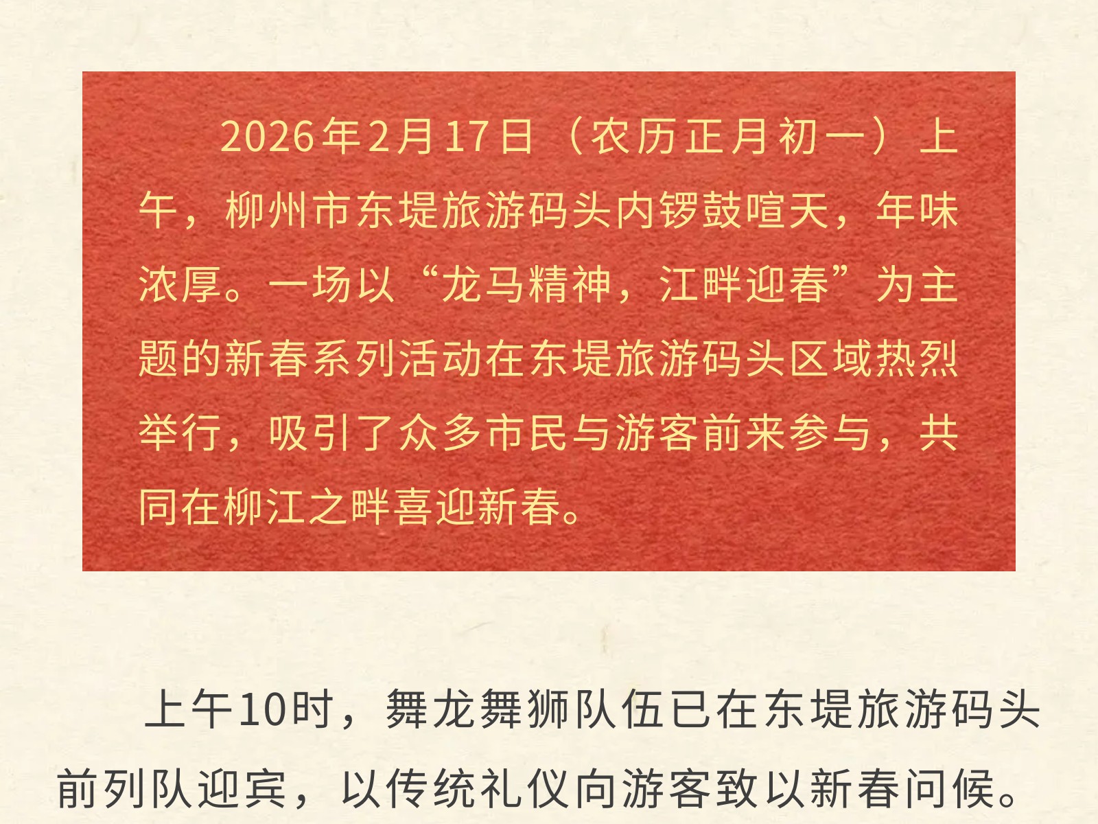 百里柳江景區(qū)“龍馬精神”迎新春,正月初一五船齊發(fā)迎客來 發(fā)布時間:2026年02月17日 13時來源:本站原創(chuàng)瀏覽:12 人次