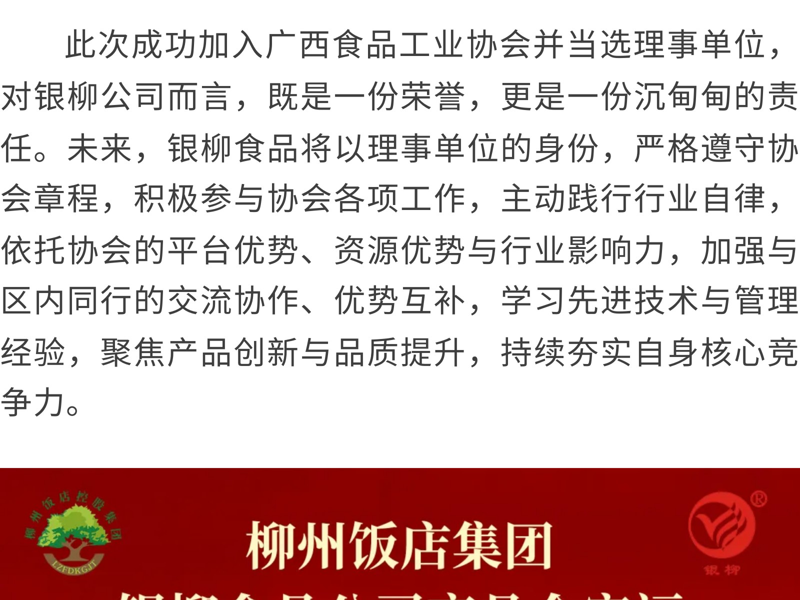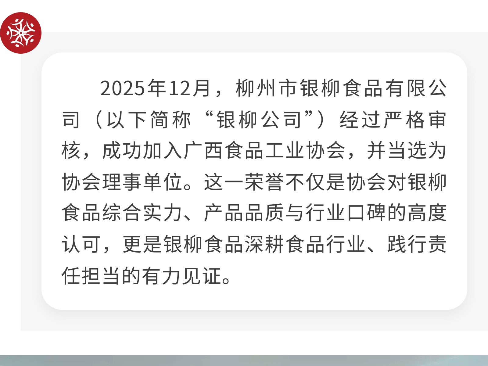 凝心聚力啟新程、勇?lián)姑蛭磥怼菔秀y柳食品有限公司當(dāng)選廣西食品工業(yè)協(xié)會(huì)理事單位 發(fā)布時(shí)間:2026年02月25日 15時(shí)來源:本站原創(chuàng)瀏覽:8 人次