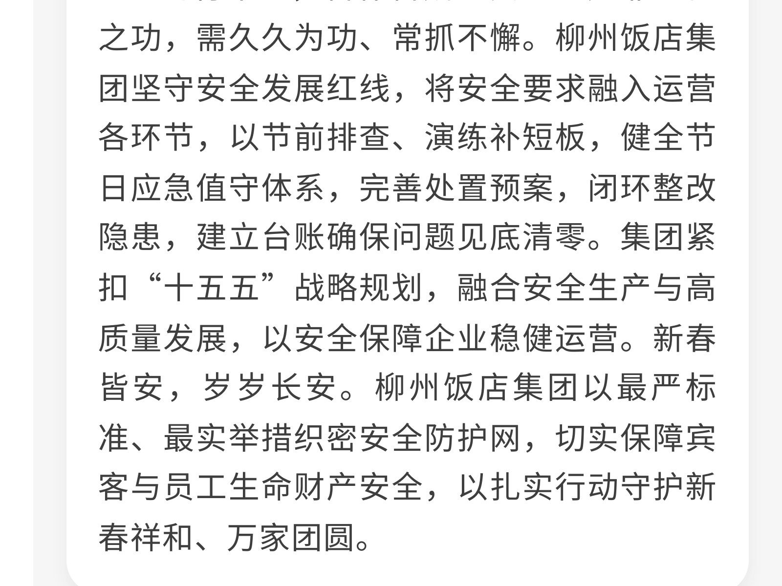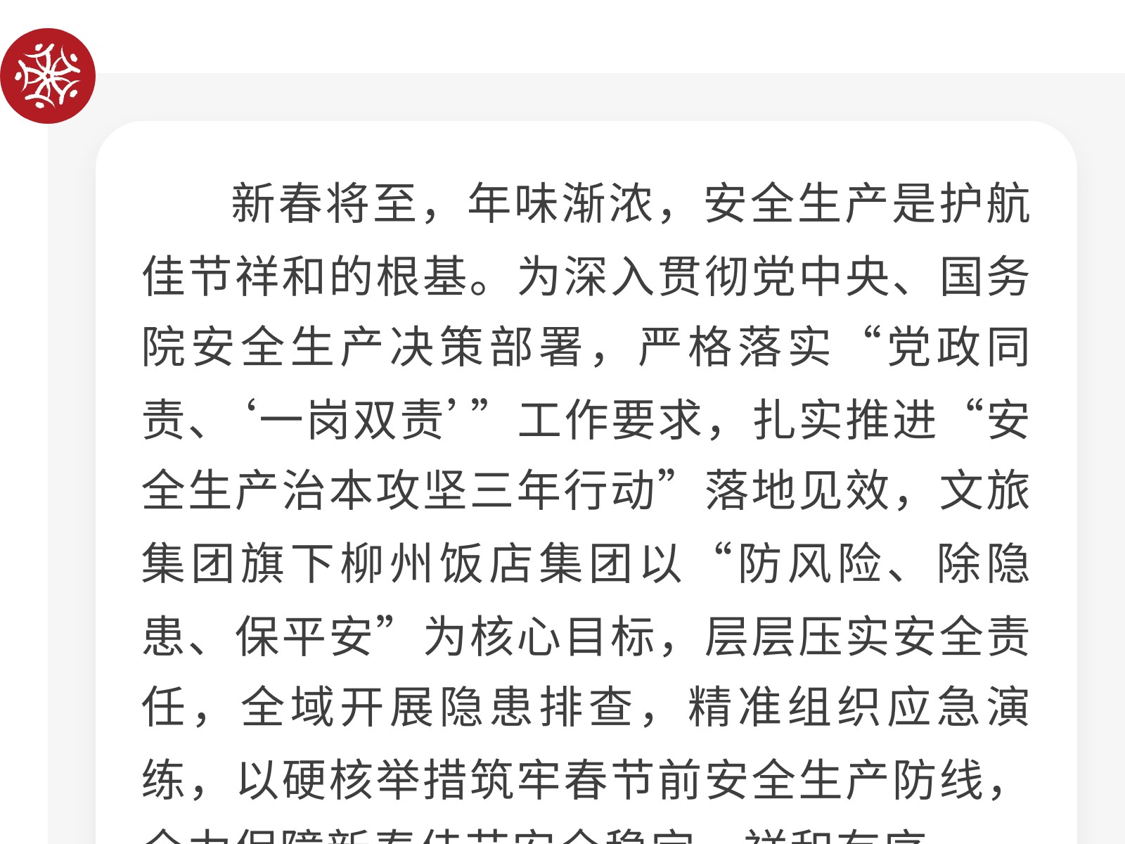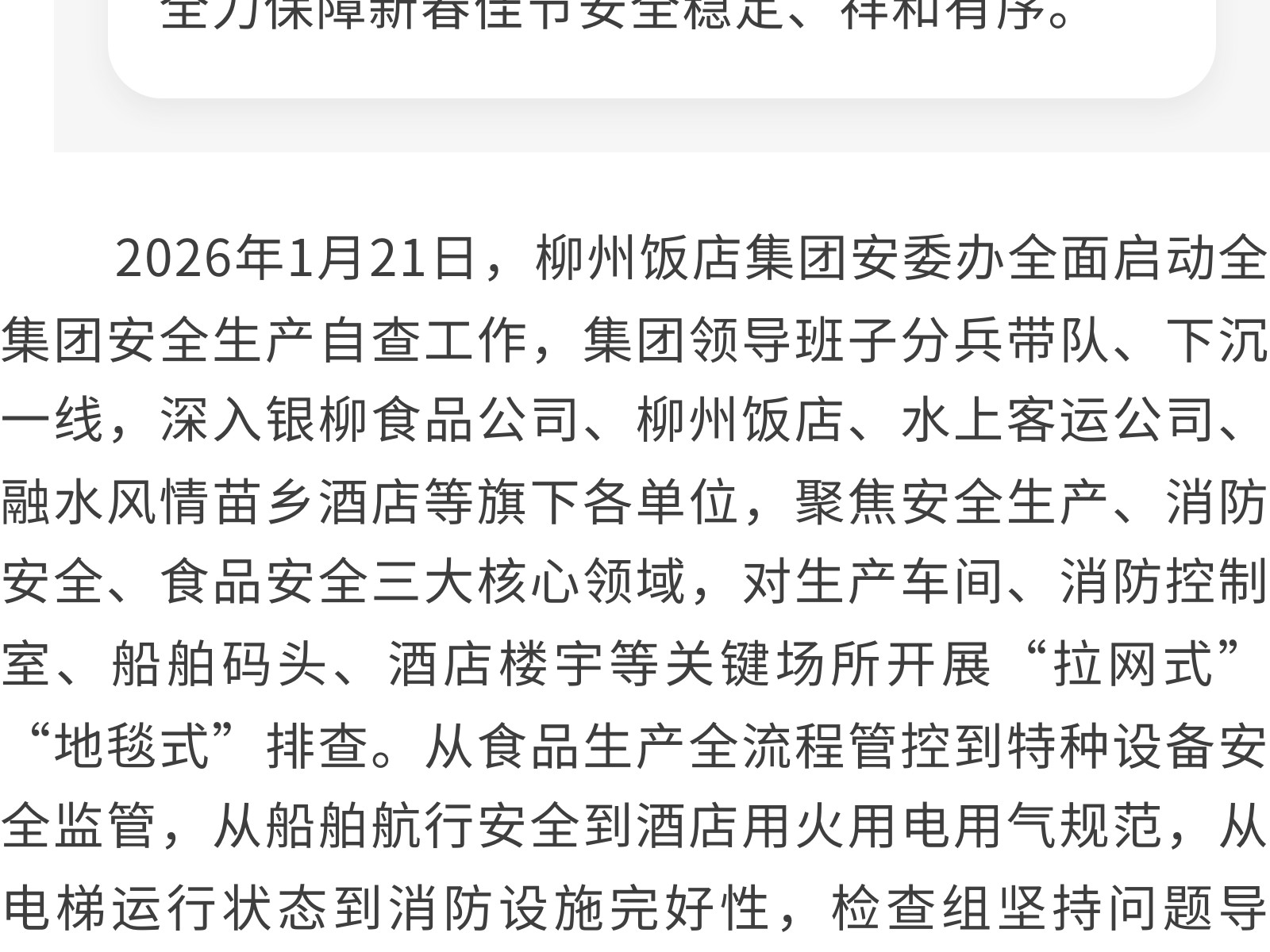 織密安全防護網(wǎng) 護航新春平安年——柳州飯店集團開展春節(jié)前安全生產(chǎn)系列活動 發(fā)布時間:2026年02月13日 13時來源:本站原創(chuàng)瀏覽:9 人次