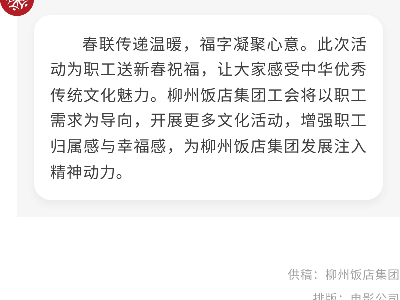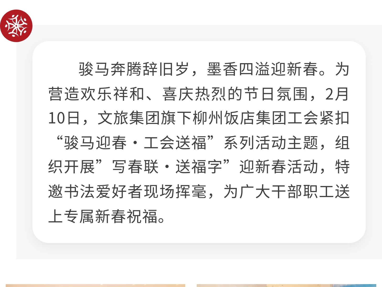 筆墨迎新春 福聯(lián)暖人心——柳州飯店集團(tuán)開(kāi)展“寫(xiě)春聯(lián)·送福字”迎新春活動(dòng) 發(fā)布時(shí)間:2026年02月13日 13時(shí)來(lái)源:本站原創(chuàng)瀏覽:9 人次