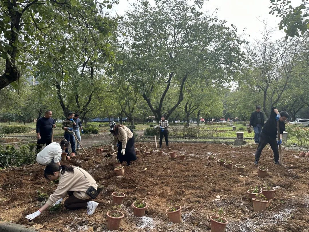 勞作現(xiàn)場(chǎng),大家踴躍參與、干勁十足,通力協(xié)作、默契配合,揮鍬填坑、放置樹苗、培土夯實(shí)、澆水施肥,各環(huán)節(jié)井然有序,最后完成了一百多棵樹苗種植工作。