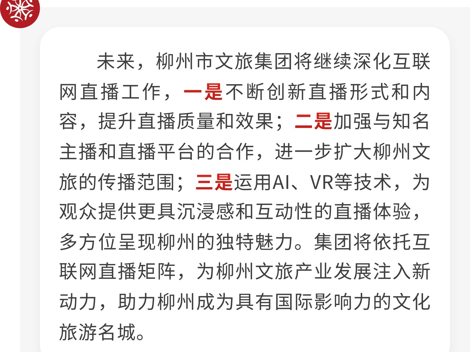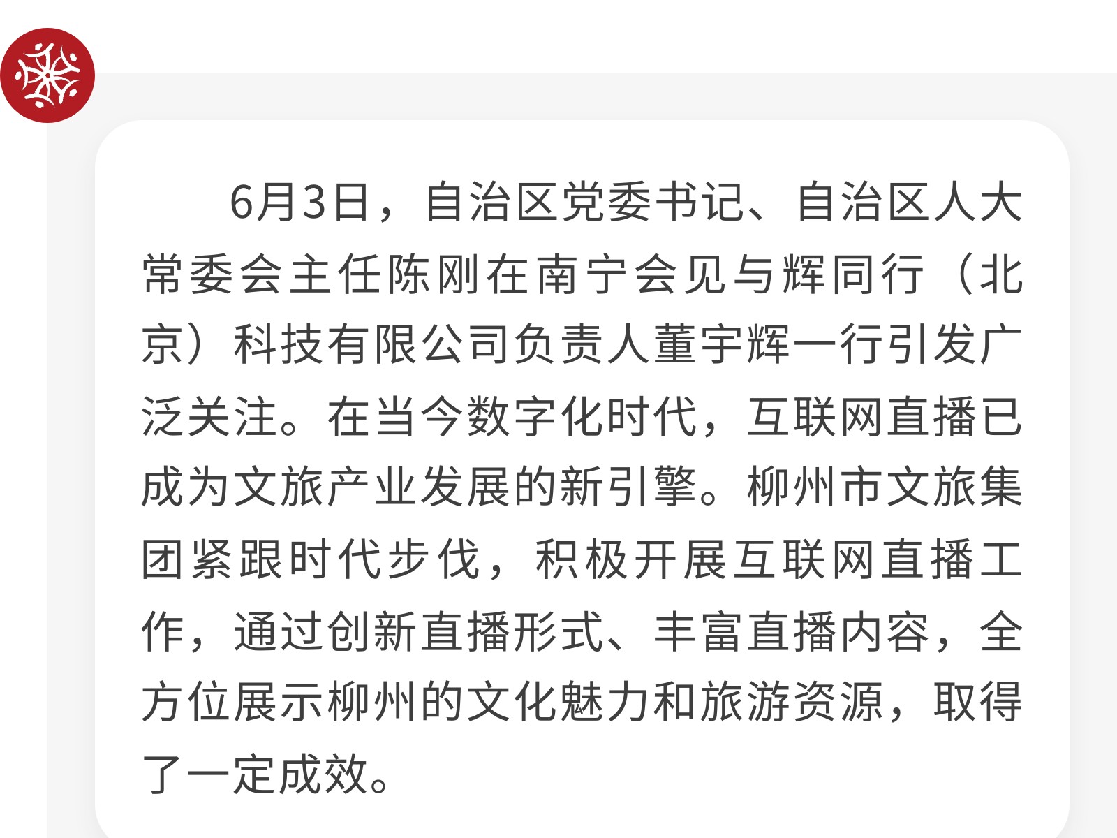柳州市文旅集團積極探索互聯(lián)網(wǎng)直播矩陣,助力城市文旅新發(fā)展 發(fā)布時間:2025年06月12日 20時來源:本站原創(chuàng)瀏覽:122 人次