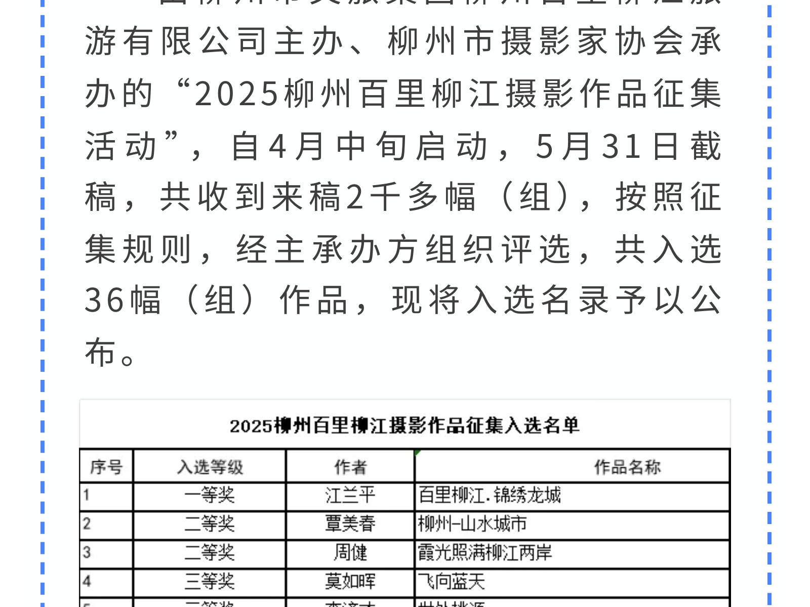 定格最美柳江!首屆“百里柳江”攝影大賽獲獎(jiǎng)作品出爐! 發(fā)布時(shí)間:2025年07月16日 10時(shí)來(lái)源:本站原創(chuàng)瀏覽:143 人次