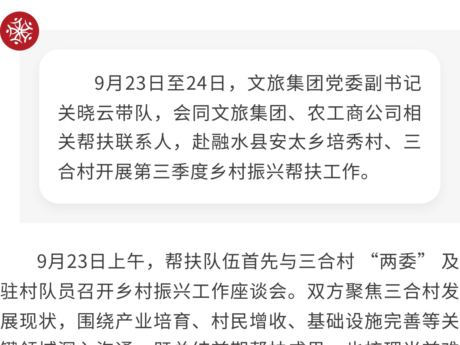 文旅集團(tuán)開(kāi)展2025年第三季度鄉(xiāng)村振興幫扶活動(dòng) 發(fā)布時(shí)間:2025年09月30日 16時(shí)來(lái)源:本站原創(chuàng)瀏覽:118 人次