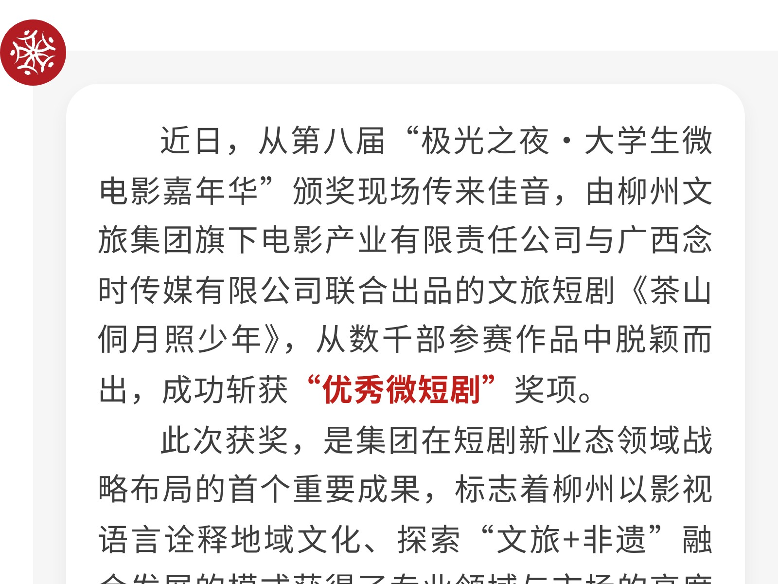 捷報!文旅集團電影公司出品短劇榮膺“極光之夜”優(yōu)秀微短劇獎 發(fā)布時間:2025年10月21日 10時來源:本站原創(chuàng)瀏覽:13 人次