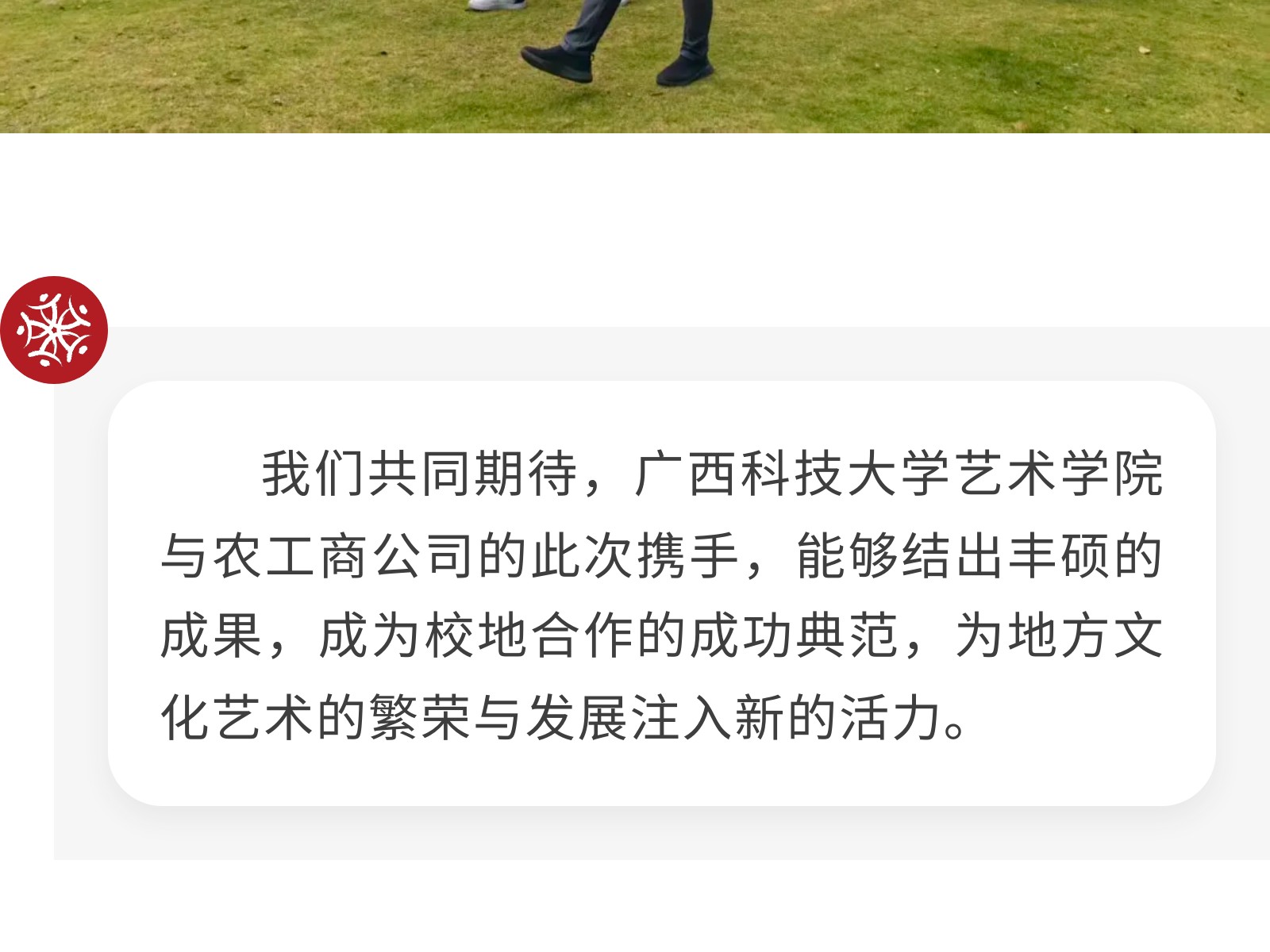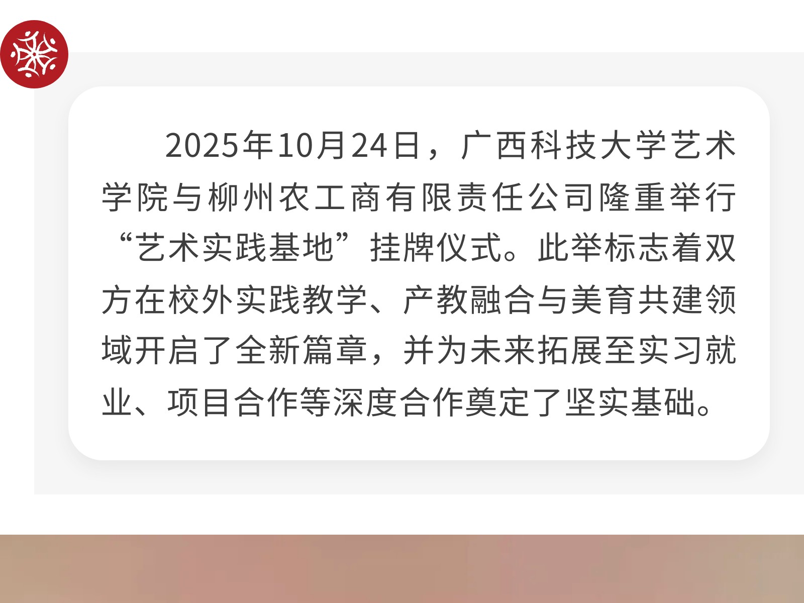 【校企攜手 共育英才】廣西科技大學(xué)藝術(shù)學(xué)院與柳州農(nóng)工商公司正式簽署校企合作協(xié)議 發(fā)布時(shí)間:2025年11月02日 10時(shí)來(lái)源:本站原創(chuàng)瀏覽:68 人次
