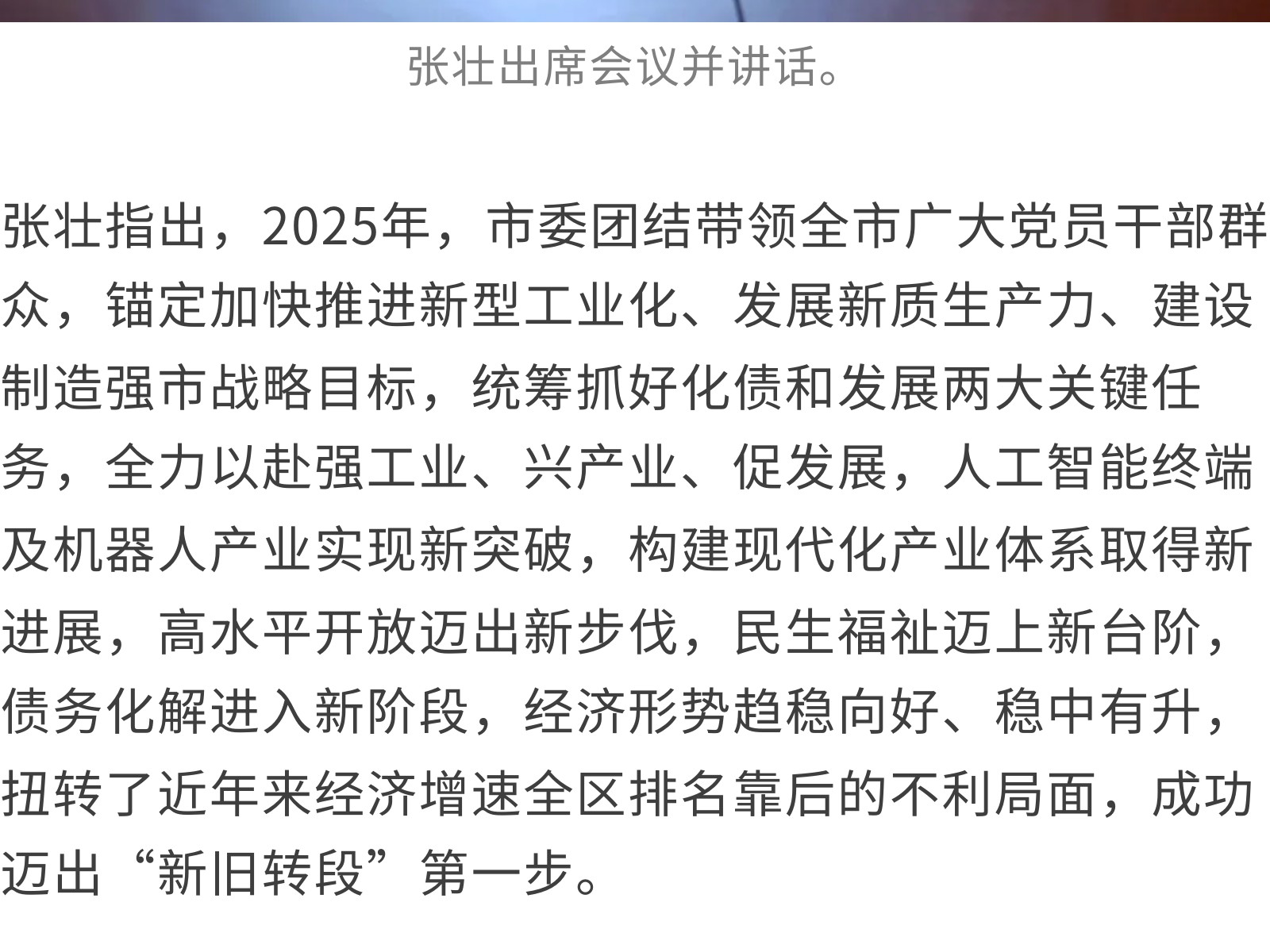 張壯在全市經(jīng)濟(jì)工作會(huì)議上強(qiáng)調(diào),今年要重點(diǎn)抓好八方面工作,確?!笆逦濉遍_好局、起好步 發(fā)布時(shí)間:2026年01月05日 13時(shí)來源:本站原創(chuàng)瀏覽:35 人次