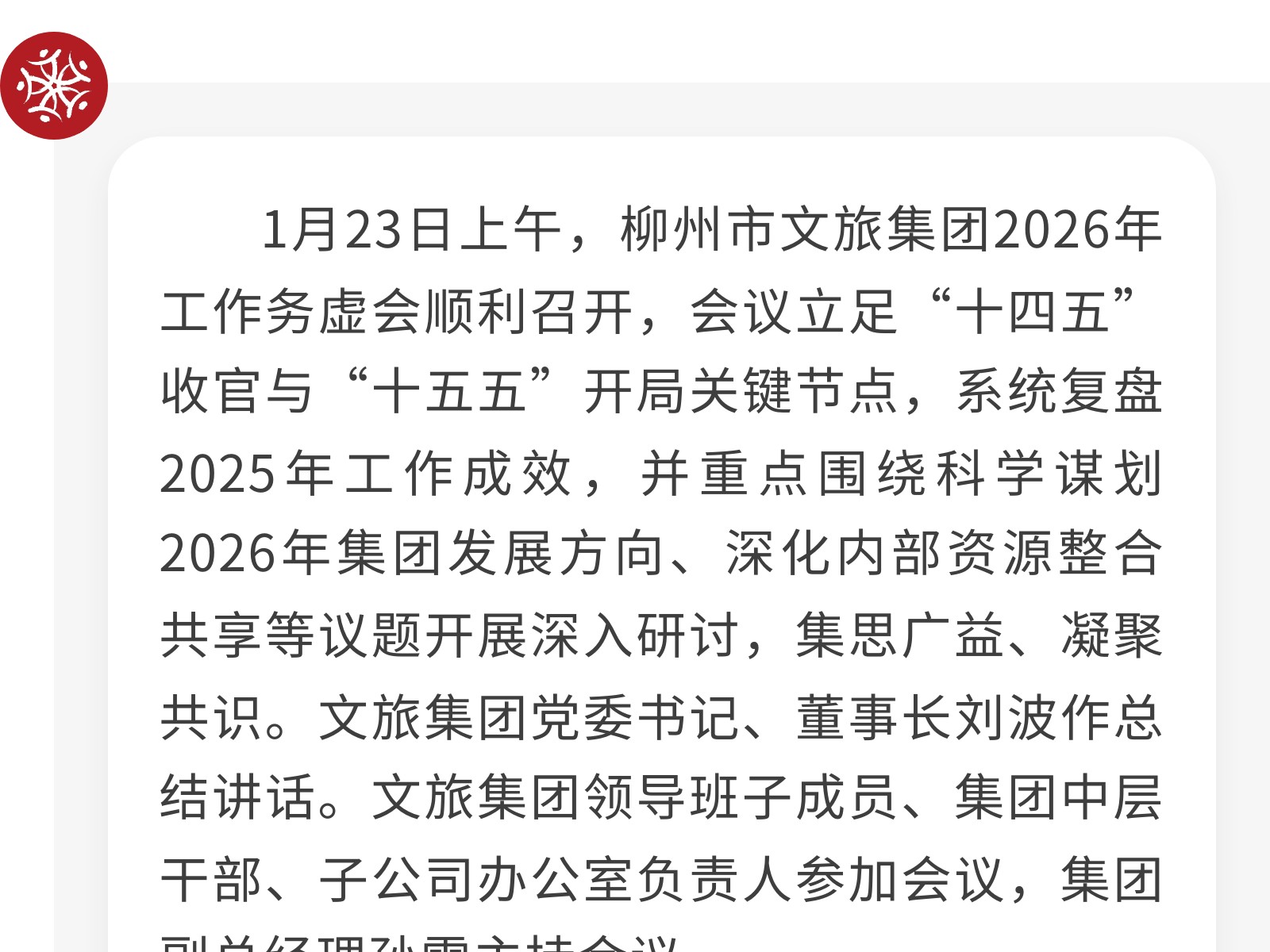 承前啟后謀新篇 凝心聚力向未來(lái)——文旅集團(tuán)召開2026年務(wù)虛會(huì) 發(fā)布時(shí)間:2026年01月27日 12時(shí)來(lái)源:本站原創(chuàng)瀏覽:38 人次