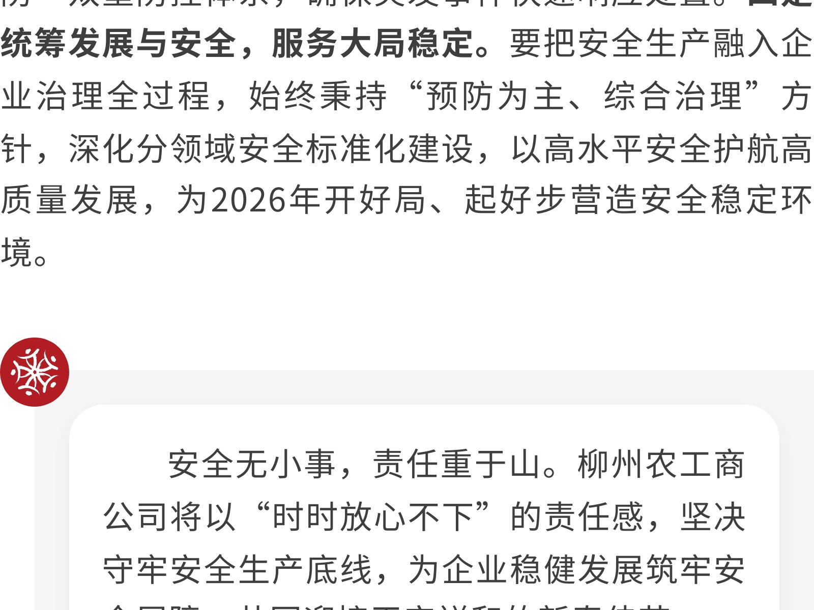 壓緊責(zé)任鏈條,筑牢歲末年初安全防線——柳州農(nóng)工商公司召開2025年度安全生產(chǎn)總結(jié)會(huì) 發(fā)布時(shí)間:2026年02月06日 12時(shí)來源:本站原創(chuàng)瀏覽:17 人次
