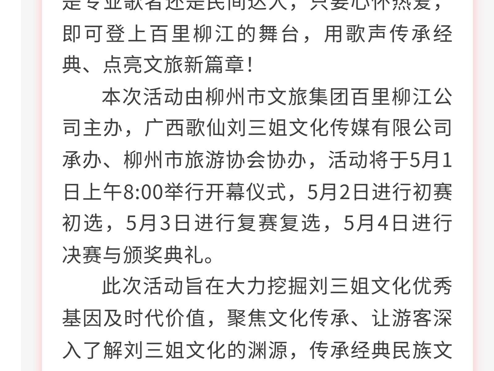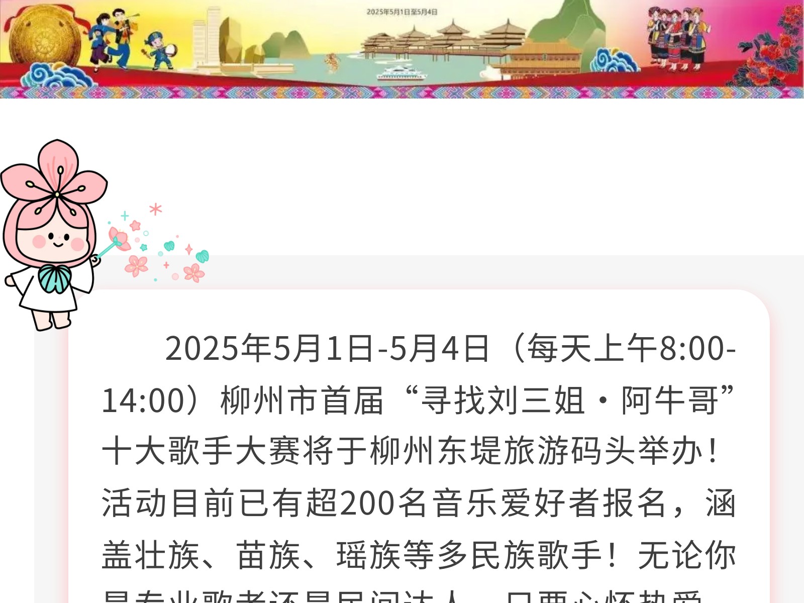 百里柳江歌仙劉三姐大舞臺等你來唱——柳州市首屆十大歌手大賽五一啟幕 發(fā)布時間:2025年04月27日 16時來源:本站原創(chuàng)瀏覽:96 人次